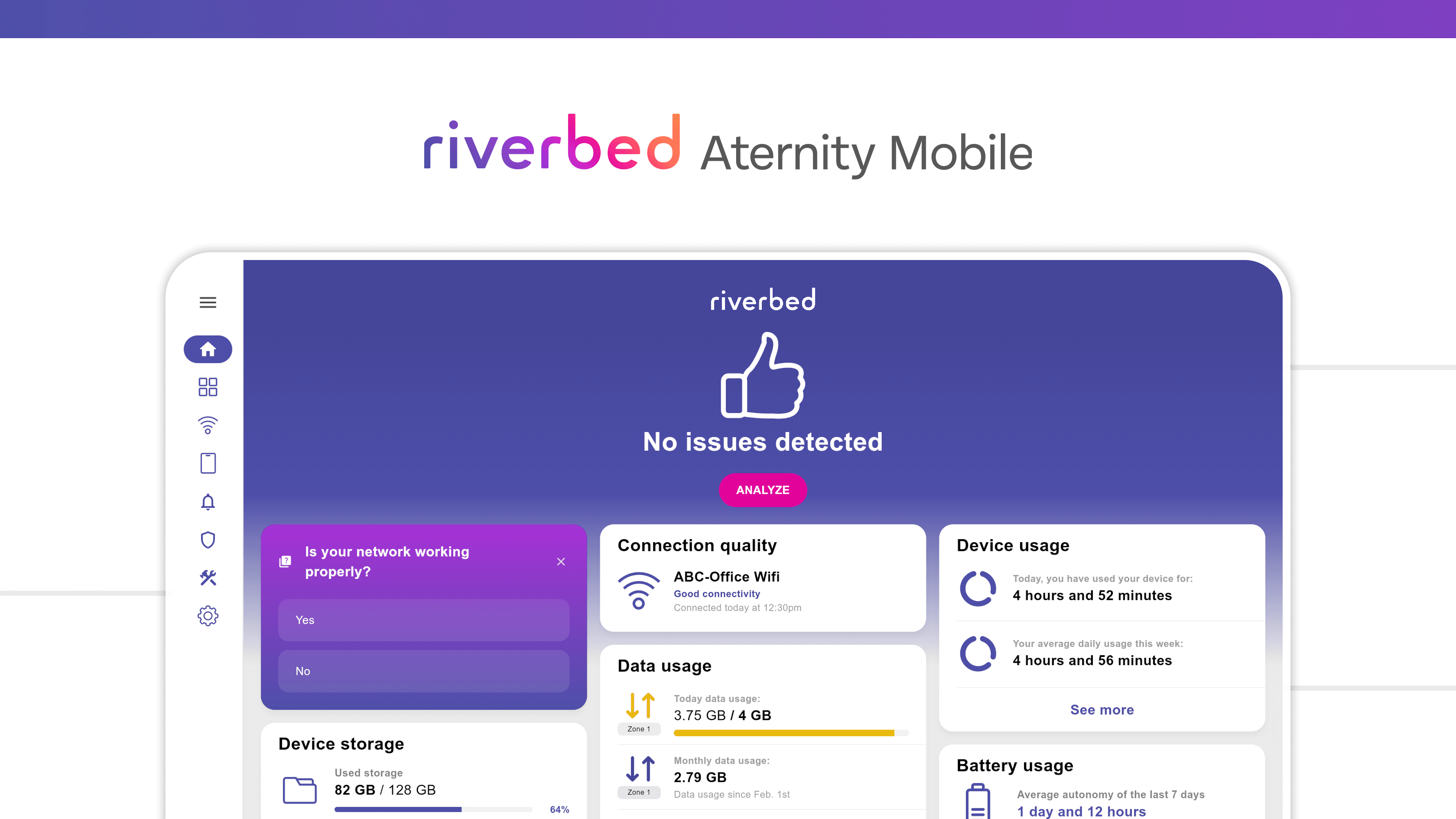 Aternity Mobile is an enterprise solution that provides IT teams with deep visibility into the real digital experience of employees on mobile devices. It monitors device health, application performance, network activity, and security threats across Android and iOS, enabling proactive issue detection, policy enforcement, and improved workforce productivity as part of Riverbed’s unified observability platform.